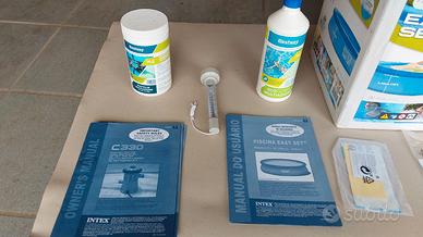 Vendo piscina piccola da giardino . Usata poche ore inoltre: termometro, cloro in pastiglie da inserire nel ricircolo acqua, anti alghe, e pompa ricircolo con filtri.