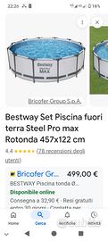 Piscina fuori terra circolare, completa di tutti gli accessori,misura 4.57 MT a tutto tondo, altezza massima in commercio di 1.22 MT,completa di scaletta con sistema di sicurezza e motore ricircolo, usata due stagioni e posta in vendita per passaggio a piscina interrata.