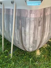 Piscina come da foto ancora montata e in funzione, ha un piccolo foro nell’angolo che è stato riparato ed è come nuovanon , dotata di schimmer, pompa super potente acquistata 2 anni fa, due kit palline tessuto per filtraggio se non si vuole usare la sabbia, kit di riparazione (nastro appena acquistato), vari tubi di ricambio, retino, filtro per aspiare il fondo, scala, porta pastiglia cloro, telo di copertura . Solo ritiro. Prezzo trattabile.