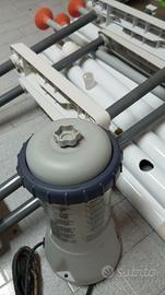 piscina in perfette condizioni (usata solo due anni) le misure sono nell'immagine completa di pompa piccola, scala e tubature anch'esse in perfette condizioni. ingiallitura dovuta al sole cambio per acquisto nuova più grande