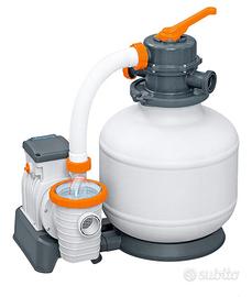 Piscina fuori terra Bestway 412x201x122 con scaletta, pompa di filtraggio a sabbia Bestway da 11.355 L/h e robot pulitore Winny 200 senza filo con batteria ricaricabile.