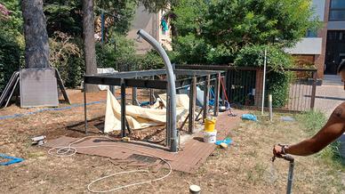 Piscina fuori terra con telaio in legno e ferro, pannelli di rifinitura effetto vimini. Compresi filtro, pompa, doccia esterna e robottino per la pulizia del fondo. Smontabile e con dimensioni di circa 4,5×2,20×1,60. Spedizione da definire. Prezzo da discutere. Per maggiori informazioni o foto scrivermi in privato.