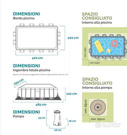 Salve a tutti vendo piscina INTEX fuori terra nuovissima montata solo una volta lanno scorso per una durata di 20 giorno massimo e poi lho rismontata…nuovissima come nuova con scaletta e motore ….la vendo per nn utilizzo misire 4metri x 2metri x 1.2metri