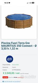 Come foto dal sito BS VILLAGE , piscina fuori terra diametro 3,5 m , altezza 1,32 m acquistata nel 2022. Struttura in acciaio autoportante Struttura ovale con decoro effetto legno Pareti in acciaio 45/100 Profili in acciaio: 15 cm Rinforzi: 12 cm Liner: in PVC colore beige 40/100 Skimmer Visionabile, smontaggio e trasporto a carico dell’acquirente. Compreso nel prezzo regalo robot senza fili per pulire pareti e il fondo, acquistato l’anno scorso del valore di 600 euro. Se piace lascio anche striscie di erva finta acquistae da Leroy Merlin valore 500 euro.