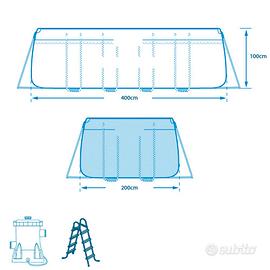 Piscina rettangolare INTEX 26788 Prism Frame 400 x 200 x 100 Fuoriterra CON POMPA FILTRO cod.28604 flusso d’acqua 2,006 l/h, flusso di sistema 1,798 l/h, voltaggio 220-240V, SCALETTA DOPPIA, capacità acqua al 90% 6.836 L, COLORE BLU, TEMPO DI MONTAGGIO 45′ 2 PERSONE.