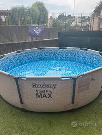 Piscina forma circolare vendo perche non utilizziamo piu. Aveva un piccolo foro ma e stata sistemata compresa di pompa con filtro e tubi nuovi piu copertura a posta inclusi. Molto bella per i bambini alzezza dell acqua 76cm.É stata usata per due stagioni e poi ritirata e pulita e rimessa nella sua acatola originale