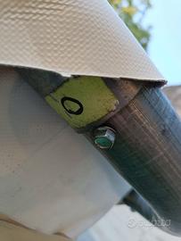 piscina fuori terra. dimensioni in metri 6,00x3,00x1,35. realizzata in acciaio tubolare autoportante, montato ad incastro, con sacco liner, completa di skimmer, pompa, sistema di filtrazione a sabbia, di scaletta di accesso e kit di pulizia
