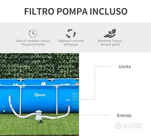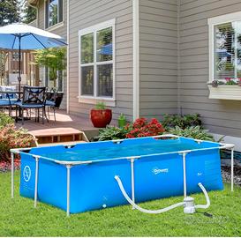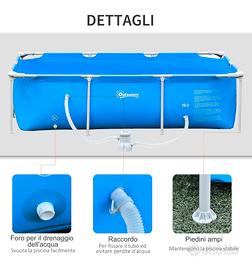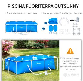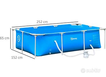 Piscina Rettangolare Fuori Terra con Filtro e Valvola in Acciaio e PVC colore blu Marchio Outsunny Capacità252 Litri Diensioni del prodotto 2,52L x 1,52l x 0,65H metri Forma Rettangolare Colore Blu Materiale1000D PVC, tubi di sostegno in acciaio,FILTRO INCLUSO: è dotata di pompa e cartuccia filtrante per favorire il ricircolo dell'acqua e mantenerla sempre cristallina. Cartuccia di ricambio PARETI RINFORZATE: Costruite in PVC 1000D, le pareti di questa piscina fuoriterra sono progettate per resistere alle abrasioni e alla luce del sole. Facile da installare, include il manuale di istruzioni. La struttura in acciaio della piscina da giardino è verniciata con materiali antiruggine e i piedini sono antiscivolo. Facile da installare, da riempire e da svuotare, la piscina rettangolare ha un foro per il drenaggio dell'acqua. INCLUSI: filtro pompa, colla per riparazione, 2 spine, 1 valvola a tre vie, Kit pulizia, Cartine tester per verifica acqua, Dosatore Bestway per pastiglie cloro galleggiante per piscin, Kit per la pulizia composto da spazzola aspirante ad acqua, spugna speciale togli muschio, kit cartine tester per verificare parametri acqua. In dotazione Scaletta ad U capovolta per entrare facilmente nella piscina. Per montare la piscina Outsunny c’è bisogno di uno spazio consigliato di almeno: 300 x 200 cm per permettere movimento sicuro intorno alla piscina Si consiglia di lasciare almeno 25-30 cm liberi su tutti i lati per: * Accesso sicuro per entrare e uscire * Spazio per il posizionamento della pompa filtro * Manutenzione e pulizia È fondamentale preparare una superficie adeguata: Terreno livellato e privo di pietre, rami o oggetti taglienti,Superficie piana per garantire stabilità e distribuzione uniforme dell'acqua Base compatta (erba ben rasata, cemento o piastrelle) Utilizzare un telo protettivo sotto la piscina per proteggere il fondo in PVC dalle abrasioni, Evitare superfici inclinate