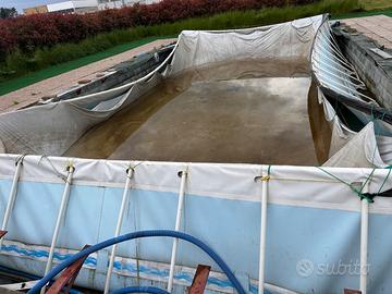 Fornita di skimmer ad immersione, di due teli per copertura, toppe per chiusura eventuali forature (ad oggi mai usate la piscina non ha mai avuto perdite) e ovviamente la sua pompa per il filtraggio acqua già piena di sabbia apposita per il filtraggio. La piscina viene fornita smontata, ritiro e trasporto a cura dell’acquirente, prezzo trattabile.