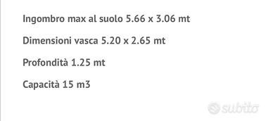Vendo bellissima piscina fuori terra modello Futura 550 della Poolmaster by New Plast. Misure piscina: lunghezza 520 cm - larghezza 265 cm - altezza 125 cm. Capacità 15 mt cubi. Prodotto 100% italiano. Ottima qualità liner. Robusto e resistente. La piscina é in buonissime condizioni. Perfettamente funzionante. Completa di skimmer, tubi di collegamento e pompa di filtrazione Bestway potente (superiore alle effettive esigenze della vasca). Acquistata più potente per garantire un perfetto ricambio dell’acqua. Pompa a sabbia o a palline filtranti. Serbatoio della pompa nuovo. Acquistato alla fine della scorsa stagione estiva e non utilizzato. La pompa ha fatto una sola stagione. L’anno scorso sono state sostituite le bocchette di immissione e scarico acqua e i tubi di collegamento alla pompa. Per cui anche questi sono quasi nuovi. Compreso nel prezzo fornisco telo a bolle d’aria da utilizzare per coprire la vasca e mantenere la temperatura dell’acqua. L’unico elemento mancante é la scaletta. Che era danneggiata e quindi é stata buttata. Per il resto é tutto ok. La piscina al momento é piena. Se venduta verrà svuotata e smontata. Trasporto a cura dell’acquirente.