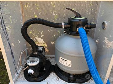 Completa di: skimmer flottante, gruppo a sabbia TF 600+sabbia, kit di collegamento, scaletta 3+3 gradini, kit di pulizia standard(canna-asta-scopa), piastra di sostegno gamba, copertura invernale e camere galleggianti a sostegno per copertura.