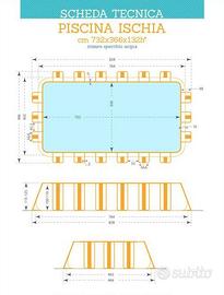 Vendesi piscina fuori terra della ditta SAN MARCO - Modello ISCHIA. Dimensioni 732x366x132 cm Comprata un'anno fa e utilizzata solamente l'estate scorsa. Completa di tutti gli accessori, teli, motore e pompa, sistema di filtrazione. Ovviamente viste le dimensioni del materiale in caso di acquisto ci metteremo d'accordo per il ritiro in loco e per caricarla sul mezzo dell'acquirente.