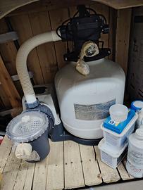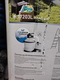 Piscina fuori terra Intex ultra xtr 5.49x2.74x1.32 Da 17203litri Montata 3stagioni. Compreso nel prezzo anche filtro a sabbia Krystal clear Intex, modello SF60220-2, DA 12 Metri cubi ora 55kg di sabbia al silicio. Filtro superiore a quello in dotazione con la piscin a in 2 ore filtra tutti i 17203 litri. l'originale era per 4.5 metrica cubi /ora. Completa di tutto sabbia utilizzata 1 stagione, coppia di adattatori tubo 38 mm ,tubo per retro lavaggio. Scaletta+telo coprì piscina. il prezzo comprendere anche il Robot Pulitore Automatico , Il tutto conservato al chiuso nelle scatole originali, La pompa è montata su un carellino per facilitare lo spostamento, sempre al coperto, ma già assemblata.