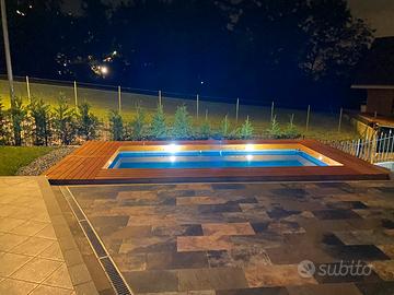 PISCINA ULTRA XTR FRAME RETTANGOLARE 549X274X132 CM, cod. 26356 - POMPA A SABBIA cod. 26644 1.1 - FLUSSO D'ACQUA da 4.500 L H - scaletta interna . Struttura di rivestimento in assi di legno , misura totale della struttura 6,4 x 3,4 circa. 6 faretti a led integrati. Cedo tutto in blocco con totale smontaggio e trasporto a cura dell’acquirente. Due lati su quattro presentano il rivestimento laterale. Quelli a vista. I due lati a contatto dei muri hanno solo i pali della struttura. Tutto perfettamente funzionante e in buono stato.