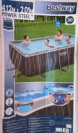Piscina fuori terra tubolare BESTWAY Power Steel2 L, di dimensioni di 4,12 x 2,01 m e un'altezza di 1,22 m. La piscina è dotata di una pompa di filtraggio a sabbia da 3.028 L/h, che garantisce acqua pulita e cristallina. Include anche una scaletta di sicurezza e un dispenser chimico ChemConnect.