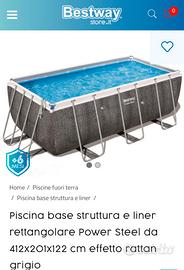 vendo piscina con struttura rettangolare rattan fuori terra 4,12m x 2,01m x 1,22m power steel bestway, con pompa filtro cartuccia e pompa di filtraggio a sabbia acquistata a parte, più kit di prodotti per trattamento acque, retino con stelo, acquistata anno 2023, usata una sola stagione, ottimo stato, causa inutilizzo