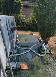 Vendo piscina fuoriterra Bestway 7,32 x 3,66 completa di filtro a sabbia (o sfere filtranti) e scala La dimensione, altezza compresa, consente la fruizione a un numero di persone simultaneo molto elevato. Sfruttando la diagonale o la circonferenza si può utilizzare anche per nuoto. Acquistata nel 2022 è stata smontata nel 2024 poi non più montata…i figli sono cresciuti… La piscina è in buone condizioni (utilizzata 2 stagioni e mezzo…) così come il filtro, praticamente nuovo e con il quale viene fornita una confezione di sfere in polietilene nuova (aqualoon 700 g). Per maggior cura del telo è stata montata su prato e con un telo di protezione sotto (si veda foto filtro) -Il telo presenta un uno strappo in un bordo alto(foto), ininfluente nell’utilizzo ma facilmente riparabile con un pezzo di tela gommata e mastice prima del montaggio o anche con dell’american tape. -Dopo qualche mese di immersione, con il cloro la parte immersa della scala perde la verniciatura: si puà facilmente porre rimedio riverniciandola con le apposite bombolette per verniciatura su superficie ossidata; è da considerare che questo intervento (semplice) sia da ripetere ogni 2 anni. Il prezzo pagato è quello da foto (Brico di Mirandola). Vengono forniti molti accessori acquistati a parte: -“robot” di pulizia Bestway Aquadrift (vedi foto), acquistato ma mai utilizzato in quanto non ho più rimontato la piscina -Spazzola aspirante con manico telescopico in alluminio e tubo per connessione alla presa filtro -Rullo per copertura solare Intex 28051 (protegge l’acqua da foglie, insetti ma lascia passare il calore. -Telo copertura per inverno -SVE 5 Svernante liquido per piscine 5 lt Se verificate in internet il valore dei soli accessori supera ampiamente la metà del prezzo richiesto e molti sono indispensabili. Visionabile (smontata) presso la mia abitazione. Deve essere ritirata presso la mia abitazione; Il telo è ingombrante e sono disponibile anche con la mia per aiutare nel trasporto