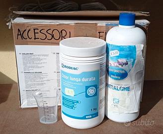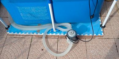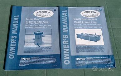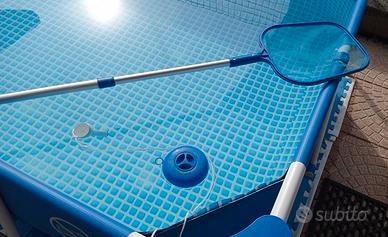 Piscina rettangolare fuoriterra Intex Modello A – F B02 16 R0 – m 2,2 x 1,5 x 0,6 (contenuto meno di 2 m3 acqua) Completa di pompa filtro Modello 602, filtri per pompa, tubi di raccordo, retino, termometro acqua, dosatore per cloro, pastiglie cloro, liquido antialghe, tappeto in gomma spugna, telo di copertura, pompa più grande di scorta (senza filtri ed altri accessori vari). Non presenta fori, abrasioni, toppe. Naturalmente sono compresi i manuali d’istruzione di piscina e pompa. Piscina di piccole dimensioni, quindi posizionabile in spazi angusti, ed inoltre il contenuto di acqua non raggiunge i 2 m3. La piscina non è attualmente montata. Materiale usato ma in buone condizioni estetiche e funzionali. Il fondo a quadri bianchi e blu presenta alcune zone sbiadite, ma non ne altera la funzionalità. Non è presente la confezione originale. Non si esegue la spedizione. Solo ritiro di persona. Vendo a 35 Euro tutto compreso.