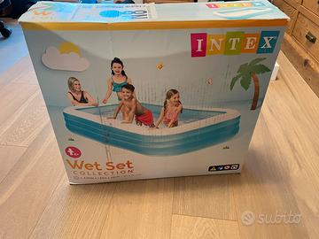 Vendo per doppio regalo piscina gonfiabile intex lunghezza 3 metri circa, larghezza 1.80m, altezza 56cm, adatta per bimbi dai 6 anni in su.
