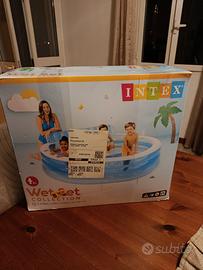 Piscina Intex Gonfiabile in Vinile 229x218x79 cm. Acquistata luglio 25. Praticamente nuova.Nella piscina c'è anche la seduta ma non si vede perché ho modificato la foto per eliminare noi seduti dentro. Adatta per grandi e piccoli
