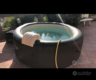 Piscina idromassaggio Intex 4 posti. ll motore è perfettamente funzionante, la piscina ha un microforo (non trovato) che richiede un refill di aria ogni 2/3 giorni (massimo 3 pompate). Si sgonfia solamente quando gonfiata al massimo mentre con il diminuire della pressione la perdita di aria diminuisce sempre più fino a interrompersi del tutto dopo circa 1 settimana. La terza foto è di anni fa e si nota la tensione della piscina completamente gonfia mentre la prima foto è la condizione dopo 24 ore dal pompaggio. Necessita di pulizia per inutilizzo prolungato. Consiglio ritiro a mano per elevati costi di spedizione (pacco grande con peso di circa 50 kg)