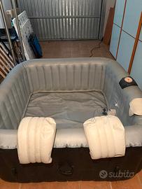 Vendo piscina idromassaggio da 6 posti per inutilizzo, usata pochissimo, auto gonfiabile. Insieme do anche due poggia testa e un “tavolino” come si può vedere in foto. Acqua riscaldabile.