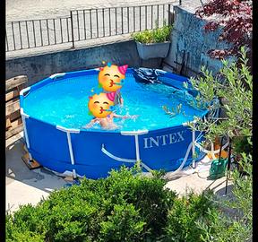 Vendo per inutilizzo,piscina tonda/prisma, Intek metal frame,305cm x 76cm ( 3m di diametro), blu,pvc 3 strati e struttura in acciaio bianco. Usata 2 volte,sempre su tappetino antiforatura fondo,si monta in 30min.