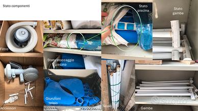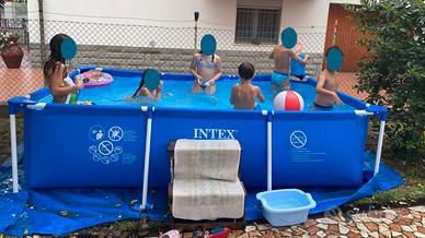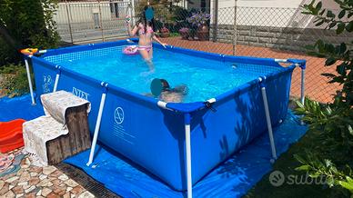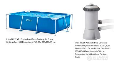 Vendo piscina Intex usata del 2021 con dimensioni 300x200x75 cm da 3.000L, compresa di pompa di filtrazione (filtro non incluso), per passaggio a piscina più grande. Ideale per far giocare e rinfrescare i bimbi senza occupare troppo spazio. In descrizione le foto della piscina e la foto dello stato degli accessori, usati ma perfettamente funzionanti. Includo nella vendita il dispenser per cloro della Intex originale comprato il mese scorso ed ancora imballato. Vendo a 65€, non trattabili. Prezzo del nuovo: 90€ la piscina, 53€ il filtro, 7€ il dispenser. Posso aggiungere anche il telo da mettere a terra (pagato 20€), attualmente non incluso nell'offerta, nello stato in cui si trova (conservato ma danneggiato in alcuni punti). Mia figlia quando l'ha ricevuta è stata felicissima! Credo lo sarebbe anche la tua/o.