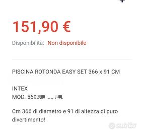 piscina Intex nuova mai utilizzata e neanche tolta dall imballo. è confezionata in una scatola neutra in quanto quella con la scatola originale era bucata e con la garanzia me l'hanno cambiata e consegnata in scatola neutra. diametro 366 cm e altezza 91 cm.