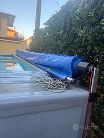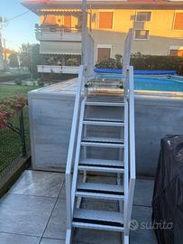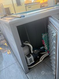 - struttura esterna per copertura piscina in alluminio con pannelli in legno navale, tre porte per ispezione zona motore e valvole mandata;