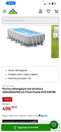 Piscina Intex Prism Frame 400x200x100 – Completa e in ottime condizioni Vendo piscina fuori terra Intex Prism Frame rettangolare 400x200x100 cm Attualmente montata in uso ✔️ Struttura tubolare stabile e resistente ✔️ Utilizzata poco 2 estati / in buone condizioni ✔️ Completa di accessori (pompa/filtro/scaletta se inclusi) ✔️ Facile da montare e smontare ✔️ attualmente montata e coperta con telo termico Ritiro a vostra cura Smontaggio a nostra cura dopo acconto La piscina è stata sempre tenuta con cura e funziona perfettamente liner in ottime condizioni Pompa inclusa originale Nuova mai usata