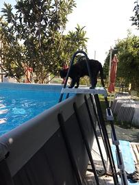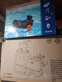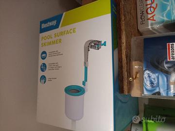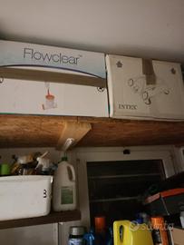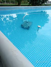 scala, telo copertura, pompa a sabbia, 2 skimmer (uno con pompa filtro a corrente e uno funzionante con pompa), 2 robot per pulizia (uno a batteria ed uno funzionante con pompa), tubi prolunga per robot pulizia, scopa per la pulizia funzionante con pompa, porta cloro
