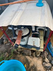 un secchio di cloro da 5 kg quasi pieno e altri prodotti per per il mantenimento dell’acqua vi vedo anche uno skimmer nuovo mai usato. non manca nessun pezzo ed è tenuta molto bene. Chiedete per altre informazioni. Ovviamente sono comprese tutte le tubature e tutti i componenti per il montaggio.