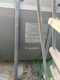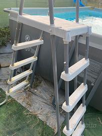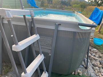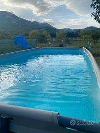 piscina INTEX di quasi 6 m di lunghezza per quasi 3 m di larghezza ci sono una scaletta, una pompa filtro a sabbia con varie funzioni tra cui retro lavaggio filtro scarico ecc . con la piscina, vi do anche una rete gonfiabile da pallavolo, kit per il test del pH , spazzole per pulire il fondale retino e aspiratore manuale per il fondo ,