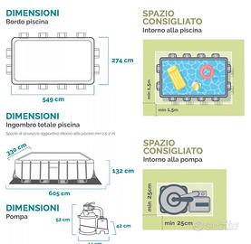 Vendo piscina Intex Ultra frame XTR misure 5,49x2,74 alta 1,32 tenuta in modo maniacale, montata solo mesi estivi, poi riposta in garage nel suo scatolo originale, completa di tutti gli accessori, pompa con filtro a sabbia, tubi aspirazione e mandata, scaletta originale e telo di copertura come da foto