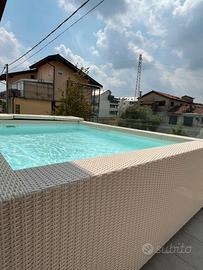 Piscina Laghetto PLAYA 2 – Rattan Beige (Riscaldamento + Idro + Doppia Copertura) Vendo Piscina Laghetto modello Playa 2, finitura esterna in fibra sintetica intrecciata (Rattan) colore Beige. Versione top di gamma con sistema wellness integrato e dotazione completa per la gestione stagionale. Specifiche Tecniche e Wellness: • Dimensioni Esterne: 220 x 320 cm. • Zona Relax: Lettino prendisole integrato con cuscino sommerso (Water Pillow). • Riscaldamento: Riscaldatore elettrico integrato con gestione della temperatura fino a 35°C. • Idromassaggio: Sistema Air Bubble (zona bolle) per massaggio ad aria integrato nella seduta. • Illuminazione: Faretto a LED bianco ad alta resa cromatica. Sistemi di Protezione e Risparmio (Inclusi): • Copertura Isotermica: Telo specifico per il mantenimento della temperatura dell'acqua e riduzione dell'evaporazione (fondamentale per l'uso del riscaldatore). • Copertura Invernale: Telo di protezione ad alta resistenza per il rimessaggio o la protezione totale durante i mesi di inutilizzo. Componentistica e Struttura: • Filtrazione: Sistema a cartuccia integrato nel bordo (skimmer) con pompa di ricircolo silenziosa. • Telaio: Acciaio Magnelis® ad alta resistenza con trattamento anticorrosione. • Rivestimento: Liner interno in PVC armato bianco (massima tenuta e riflessi cristallini). • Pannellatura: Pannelli in alluminio rivestiti in fibra sintetica intrecciata a mano. Stato e Logistica: • Condizioni: [Es: Pari al nuovo / Liner integro / Impianti testati e tagliandati nel 2026]. • Accessori Extra: [Es: Kit pulizia manuale / Prodotti trattamento acqua]. • Trasporto: Struttura modulare interamente smontabile; ritiro a carico dell’acquirente trasporto possibile con furgone medio.