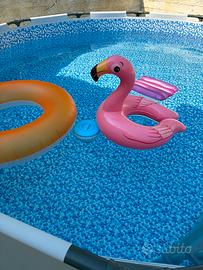 la piacina e stata utilizzata massimo 3 volte munita di copri piscina in silicone scala e motore filtro per pulire la piscina ,due funghi dove mettere le pastiglie cloro e altri prodotti tipo anti alghe anti muffa ecc vendo per cambiamento a piscina piu grande