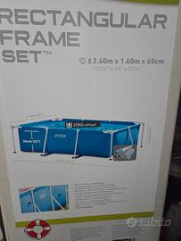 piscina 2.6m x 1.6m x 0.65m usato un anno e pulito una volta svuotata. vendiamo per trasferimento all'estero. non ho foto della piscina riempita ma la foto sulla scatola rende. copripiscina inclusa