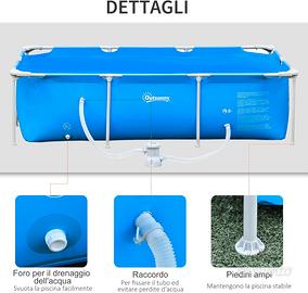 la piscina comprende tutti i tubi di drenaggio acqua ,pompa con filtro , Skinner di superfice per aspirare e tenere pulita la superfice, aspirapolvere di fondo. termometro per la temperatura del acqua e porta cloro per pastiglie, Piu tappetini da mettere sotto la piscina .