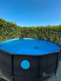 Piscina fuori terra rotonda con oblò, colore marrone, diametro 4,88 mt., altezza 1,22 mt., marca Bestway, con scaletta grigia, con pompa a sabbia da 6.000 lt. all'ora, utilizzata per quattro stagioni estive su cinque, ogni anno è stata pulita, asciugata e riposta in luogo asciutto e protetto, attualmente in veramente buone condizioni. Vendo perché non utilizzo più.