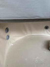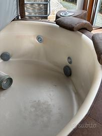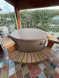 Piscina con capienza 3/4 persone, marchio softub il cui rivestimento in materiali resistenti agli agenti atmosferici presenta qualche piccola macchia. Basso consumo energetico e non richiede allacci idrici fissi, basta una presa di corrente. Rivestita in legno di acacia.