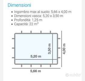Vendo piscina usata due stagioni completa di filtro a sabbia, skimmer fisso, scaletta, tubi flessibili e tutto il necessario per il montaggio. In aggiunta un armadio adibito a contenitore per il filtro e prodotti per il mantenimento dell'acqua.