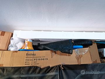 Piscina (4 metri x 2.25 metri x 1.20 metri) usata solo 2 estati in buona condizione (una piccola area è scolorita e c'è una toppa 5x2 cm circa per coprire 1,5 mm di un forellino. Bella grande per stare in famiglia o con amici, completa di filtro sabbia, scaletta e spazzola.