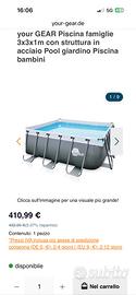 Vendo piscina YOUR GEAR 3x3x1 m con struttura in acciaio, usata una sola volta e in condizioni pari al nuovo. ✔ Pagata oltre 410€ (vedi foto) ✔ Struttura robusta in acciaio galvanizzato ✔ Liner rinforzato resistente ✔ Modello di qualità superiore rispetto alle piscine economiche ✔ Difficile da trovare in Italia ⸻ 📐 Caratteristiche: •Dimensioni vasca: 300 x 300 x 100 cm •Ingombro totale: circa 340 x 340 cm •Capacità: circa 8100 litri •Attacchi standard da 32 mm per pompa filtro •Valvola di scarico ⸻ ✅ Condizioni: •Usata una sola volta •Sempre custodita nella casetta •Completa di tutti i pezzi •Nessun difetto ⸻ 📌 Pompa non inclusa, ma facilmente collegabile (attacchi standard) ⸻ 💡 Perfetta per chi cerca una piscina solida e duratura senza spendere il prezzo del nuovo. ⸻ 📍 Ritiro a mano a Novellara (Reggio Emilia) 👉 Disponibile finché visibile 👉 No perditempo / no offerte ridicole