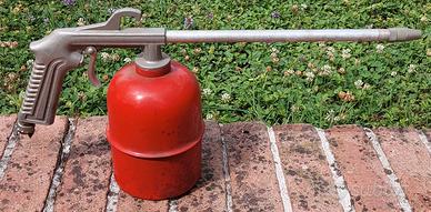 Pistola da lavaggio pneumatica con serbatoio, per la pulizia e lo sgrassaggio di diverse superfici, attrezzature e componenti meccaniche in particolare officine ed autolavaggi (ad esempio motori, trasmissioni e tutta la meccanica in genere). Funziona ad aria compressa, nebulizza il liquido detergente inserito nel serbatoio rosso pulendo efficacemente anche nei punti difficili. Possibilità di regolazione del getto. Come nuova, euro 10,00, solo consegna a mano con pagamento in contanti, non spedisco