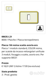 Placca resina scatto avorio-oro Placche 1 foro moduli standard, COLOR resina, per scatole da incasso rettangolari unificate 3 moduli, fissaggio a scatto, avorio-oro. Per supporto 08531 Prezzo 8€ cadauno più costo spedizione. Disponibilità di 10 pezzi ad 1 foro. VIMAR ORIGINALI.