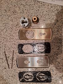 Placche per porta con due serrature in ottone dorato lucido, con sottoplacca in nylon e defender e pomolo. Defender marca Disec.