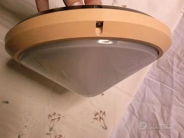 La plafoniera è stata usata ma ancora in buone condizioni. E' marchiata IP54, Classe II. Il bordo esterno in plastica è stato riverniciato e presenta alcune imperfezioni. La plafoniera ha diametro cm 26 ed è alta cm 9.