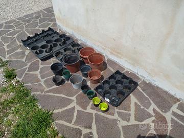 Regalo plastica da riciclare, composta da vasi e vasetti per fiori e piante di varie dimensioni, contenitori porta vasetti e simili.