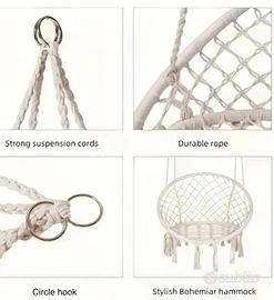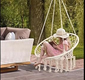 Vendo poltrona sospesa ideale per rilassarsi all’aperto o in casa. Realizzata con materiali di alta qualità, resistenti alle intemperie, perfetta per giardini, terrazze o ambienti interni.